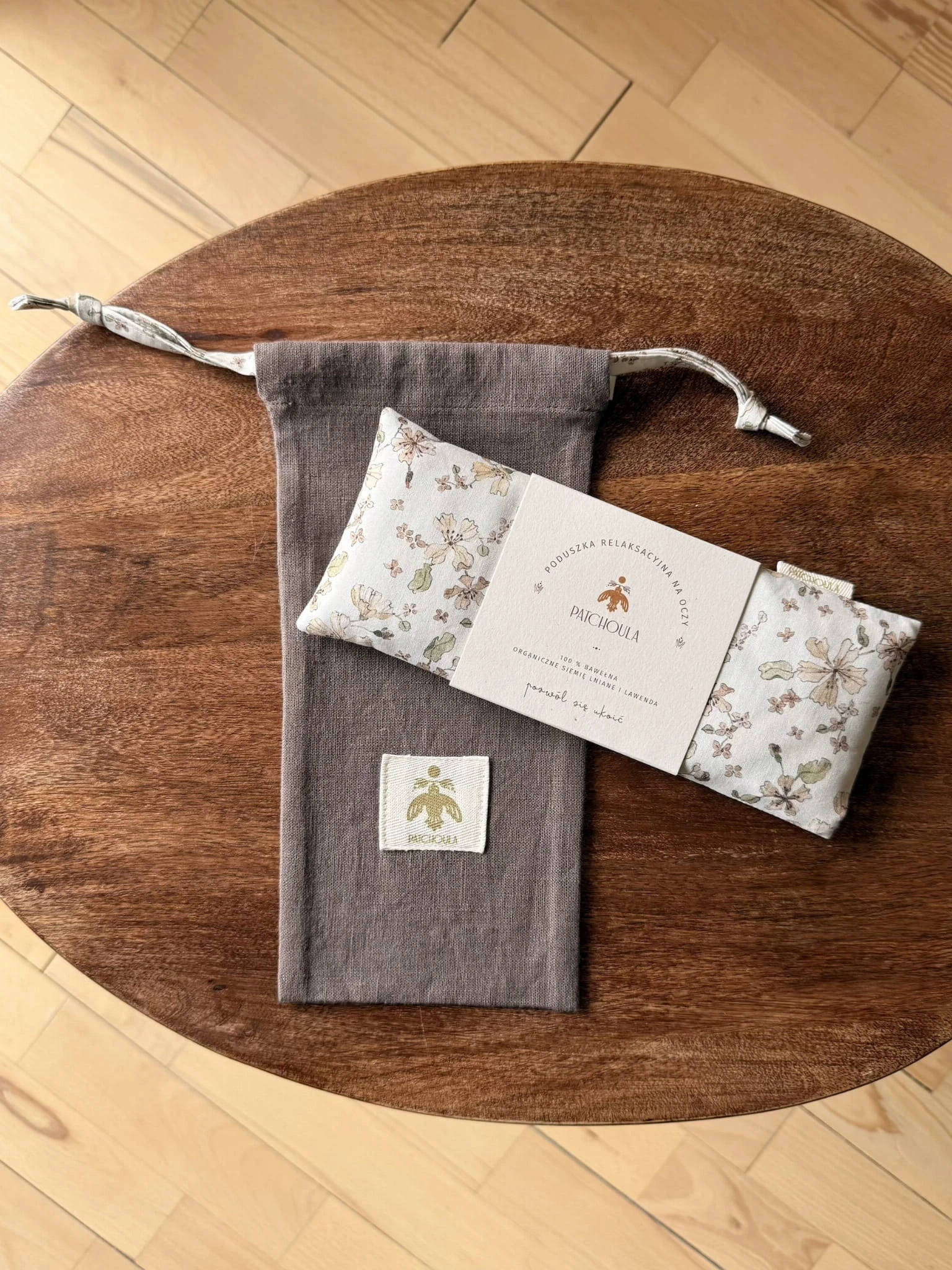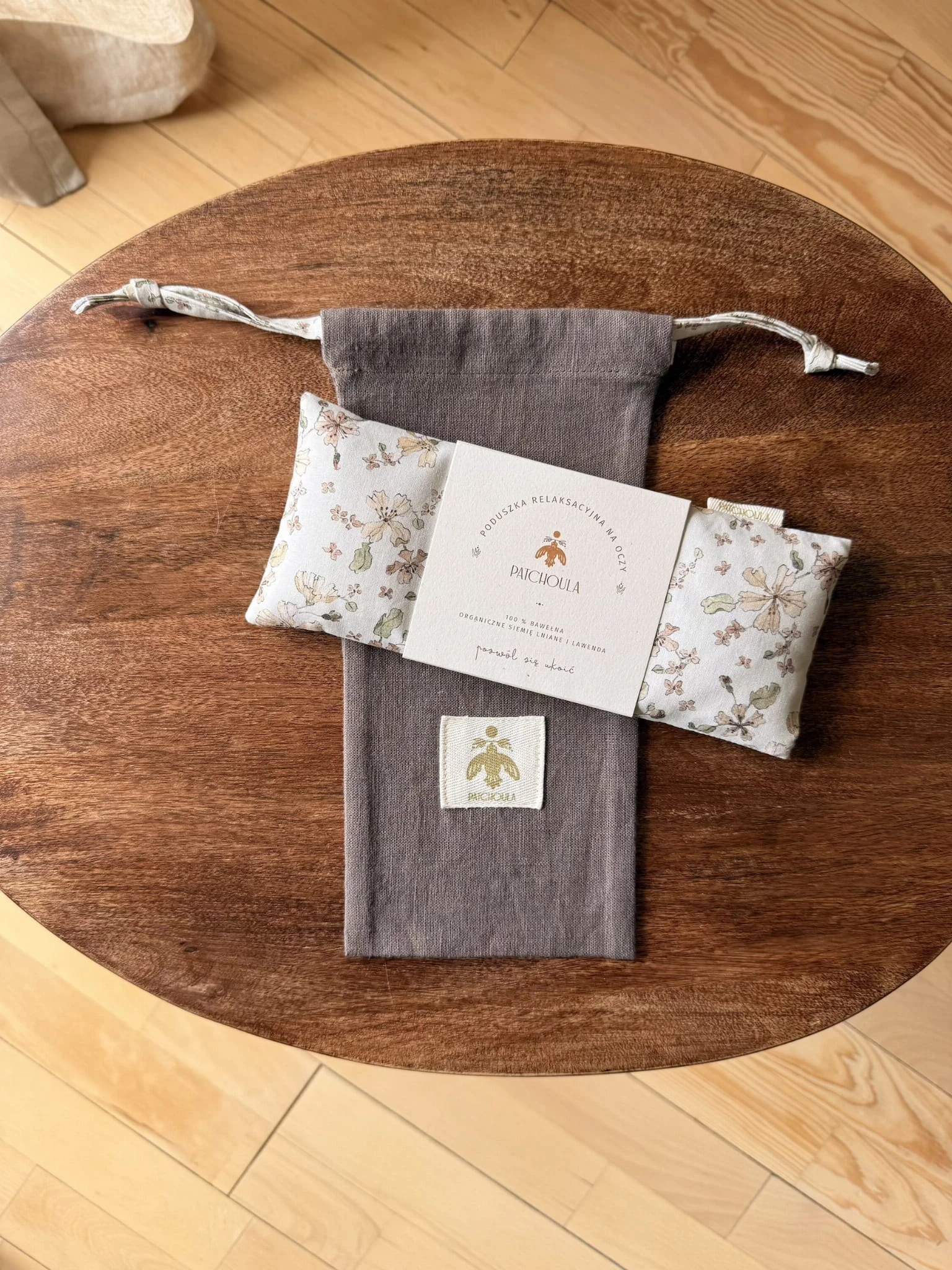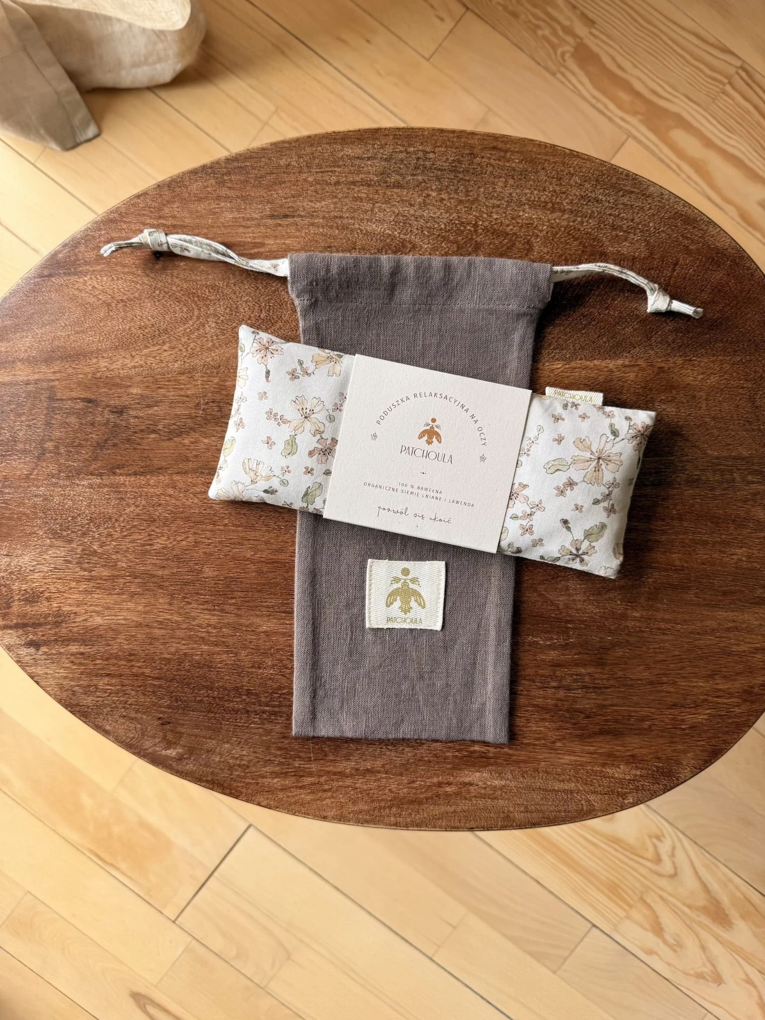 Komplet zawiera bawełnianą poduszkę relaksacyjną na oczy oraz lniany woreczek z dopasowaną kolorystycznie do poduszki tasiemką, w którym można ją przechowywać lub zabrać w podróż.