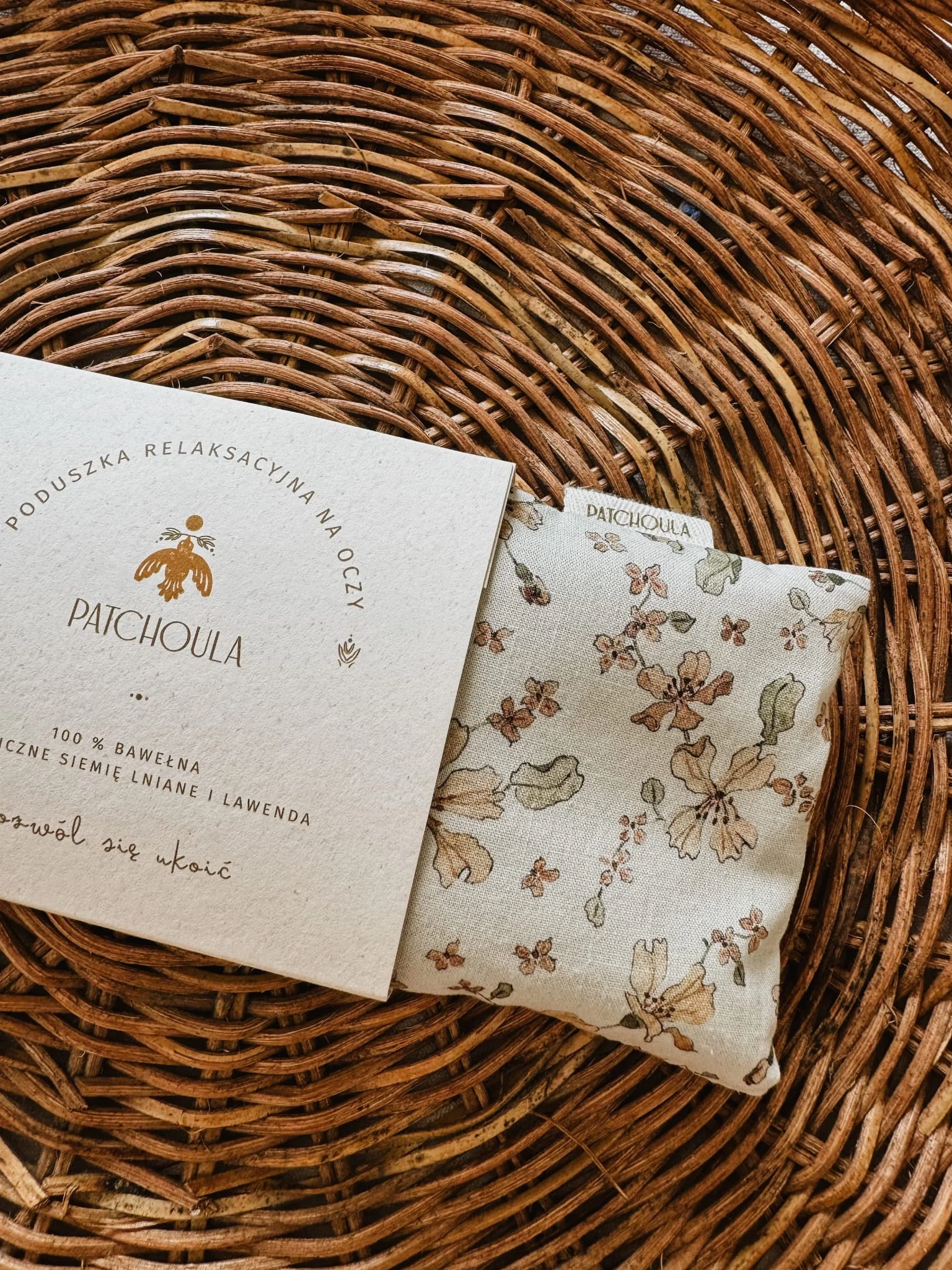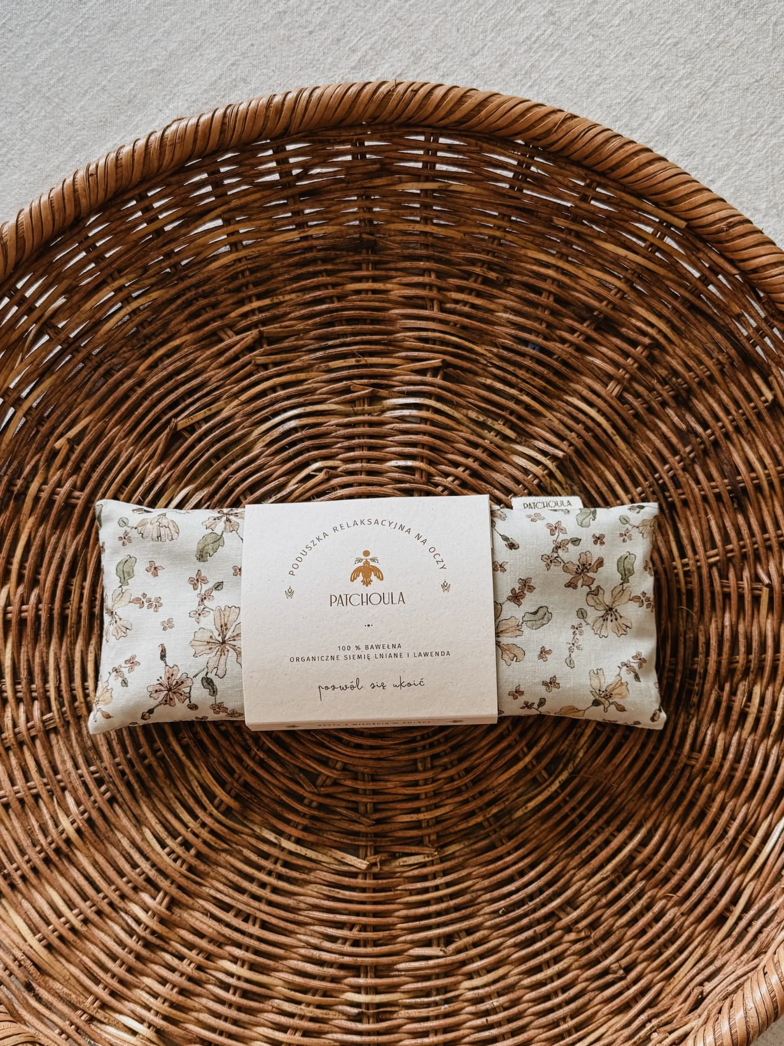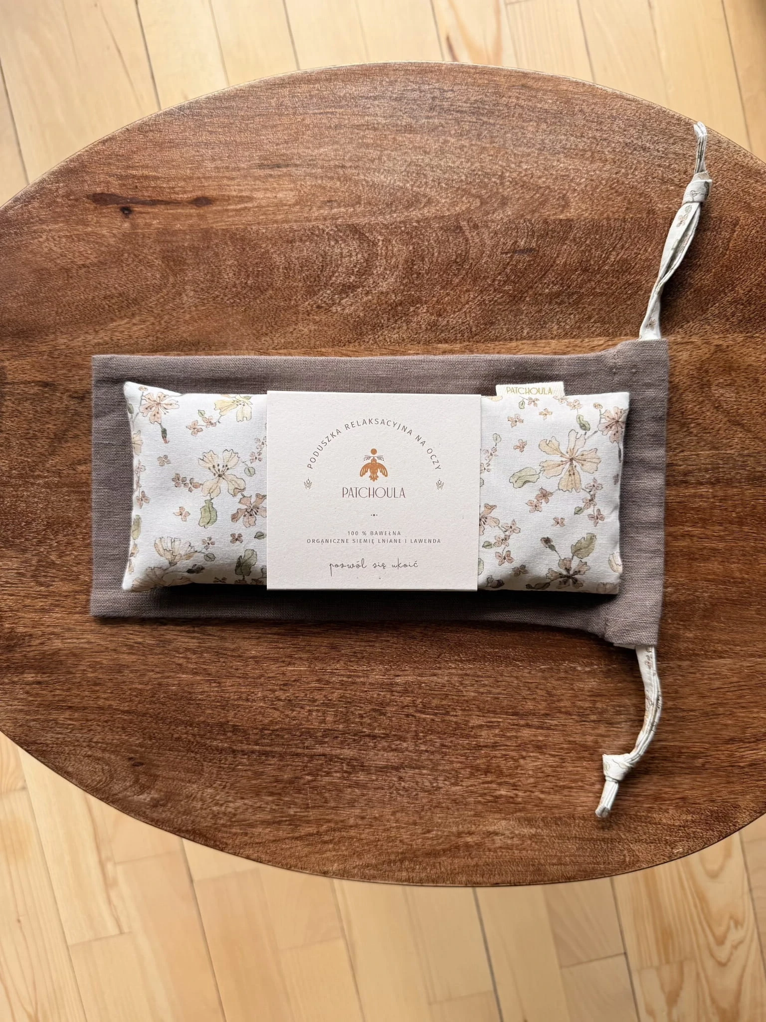 Komplet zawiera bawełnianą poduszkę relaksacyjną na oczy oraz lniany woreczek z dopasowaną kolorystycznie do poduszki tasiemką, w którym można ją przechowywać lub zabrać w podróż.